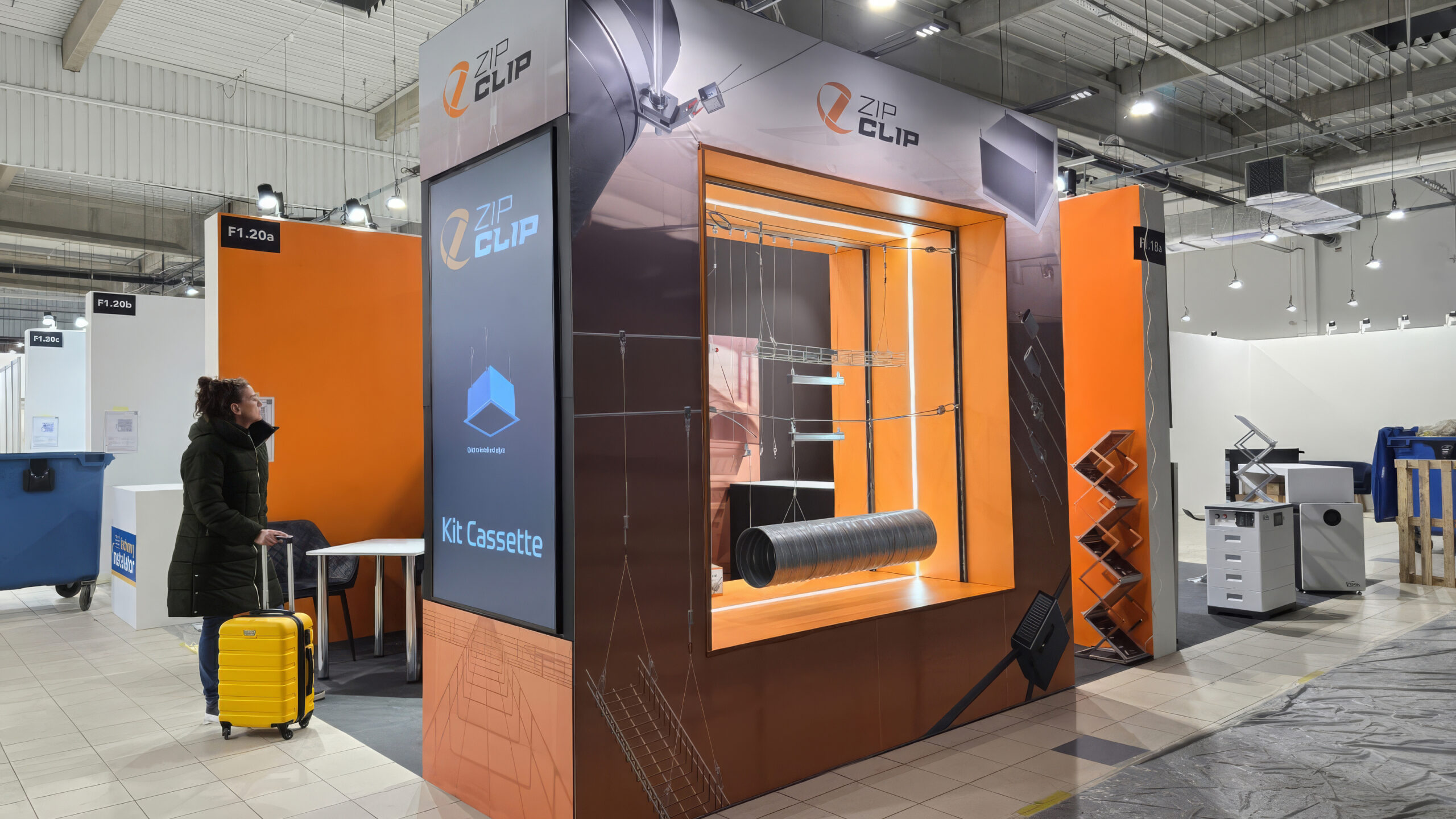 O stand modular da Zip Clip, apresentado num evento na Polónia, destaca-se pela sua versatilidade e capacidade de adaptação a diferentes espaços. Com medidas de 992 x 2976 x 2977 mm, permite a adição ou remoção de partes, oferecendo uma solução dinâmica e reutilizável. Inclui um display, 1 BeTV, 5 projetores de luz e um revestimento personalizável em têxteis ou PVC, garantindo um design moderno e funcional para destacar os produtos da marca.
